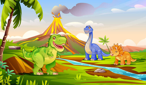 371976736 Cute Dinosaur on Beautiful Prehistoric Natural Landscape Cartoon Vector Illustration.