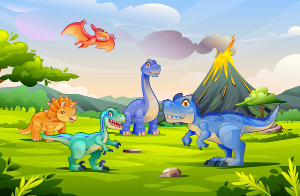 802138378 Group of dinosaurs near a volcano under clear skies in prehistoric forest. Vector cartoon illustration