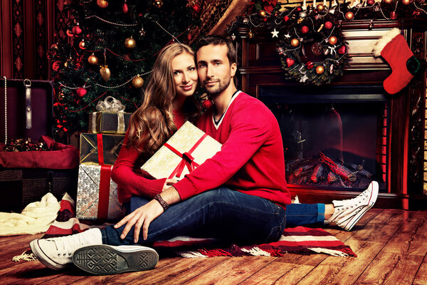 54484957 Happy young people give each other gifts by the fireplace near the Christmas tree.