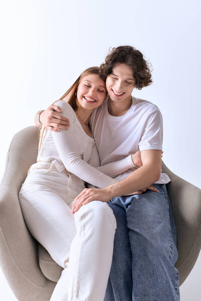 857424562 Loving couple embraces each other warmly, radiating happiness in a stylish grey setting.