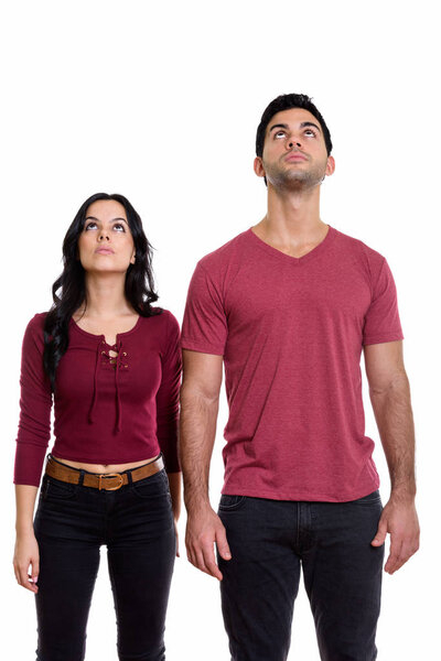 219904818 Studio shot of young couple standing and looking up together isolated against white background