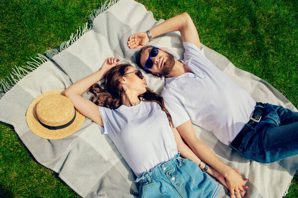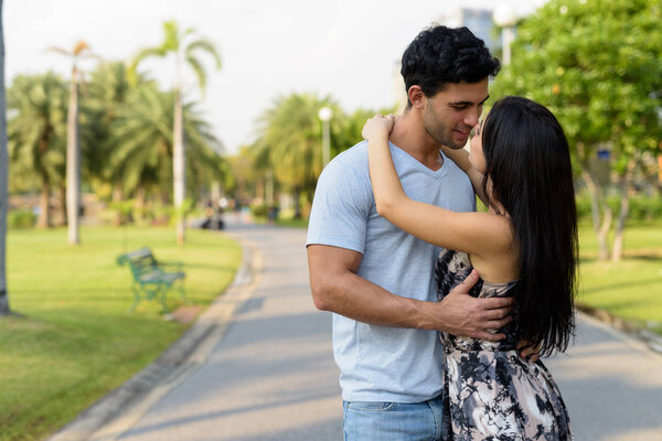 408540200 Portrait of young Hispanic couple relaxing in the park together