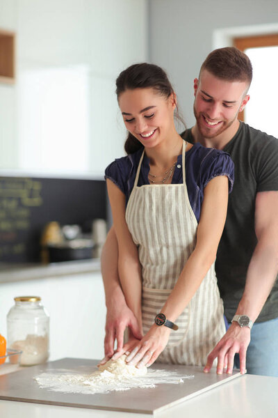799850426 Beautiful couple in love in white long-sleeves posing on the kitchen