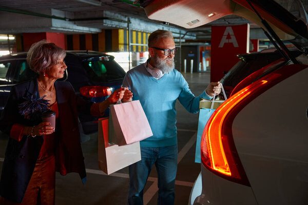 688037808 Happy satisfied elderly couple loading purchases in shopping bags into car trunk at parking lot