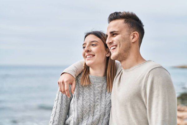 619084996 Man and woman couple smiling confident hugging each other at seaside