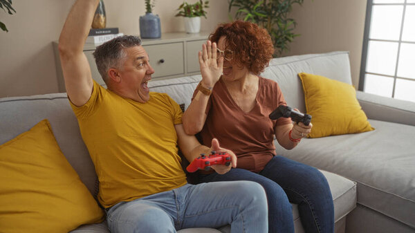 768680596 Middle-aged couple enjoying a video game together in a cozy living room with yellow pillows and indoor plants