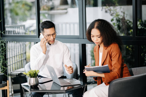 685173242 Two business workers working together at the office