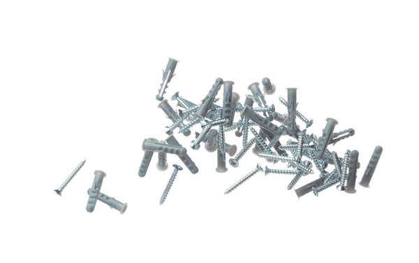662474714 Flying Plastic gray dowel and screw in air. Expansion anchors, fixing dowel with chromed screw. Many pair of screw and dowel anchors floating in group. White background isolated