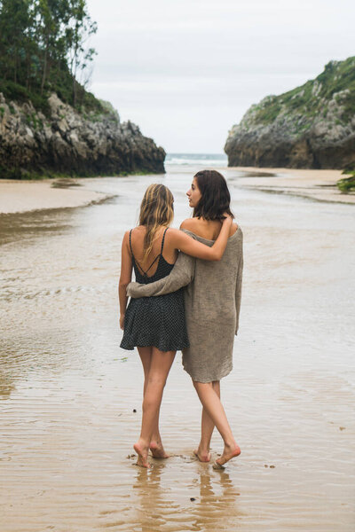 714277334 Two beautiful cheerful girl friends are having fun and hugging while walking along the avenue.
