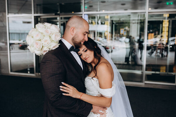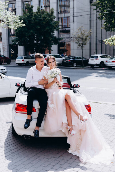 799166960 Beautiful young bride with handsome groom sitting on white car