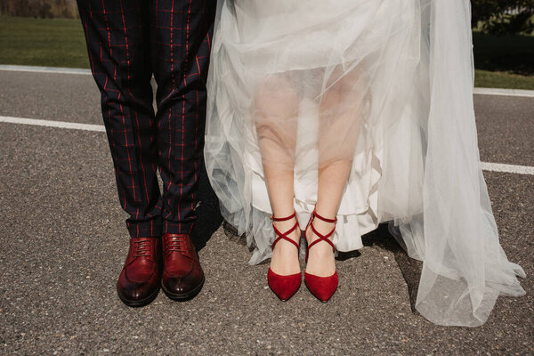 801250130 Bride and groom wearing red wedding shoes while standing on the asphalt road
