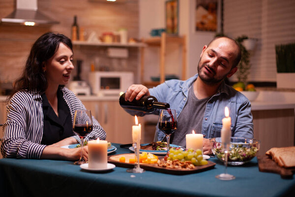663215416 Young couple holding hands and talking when having romantic dinner at home