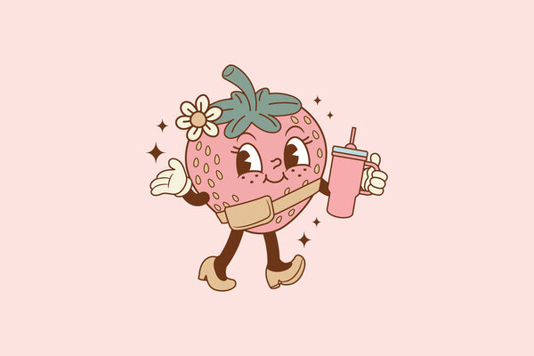 695085146 Cute retro illustration of strawberry walking with thermos in hand