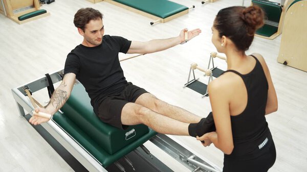 810331712 Couple of happy trainer practicing pilates reformer exercises together at gym. Hispanic man making hundred pose in the reformer for building core strength and stability, enhancing balance. Habituate.