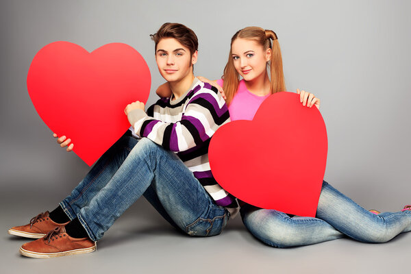 85826192 Two beautiful young people in love. Fashionable couple posing at studio.