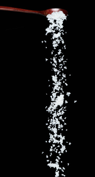631628158 Salt fall, crystal white grain peanuts explode abstract cloud fly from wooden spoon. Beautiful complete seed salt, food object design. Selective focus freeze shot black background isolated