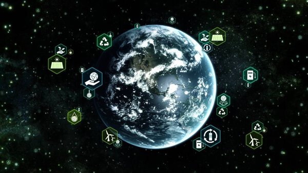 667290448 Earth in Space. Orbiting ecology infographic icons. Environmental technology and sustainable development concept 3D illustration green energy background. World map of the Americas furnished by NASA.