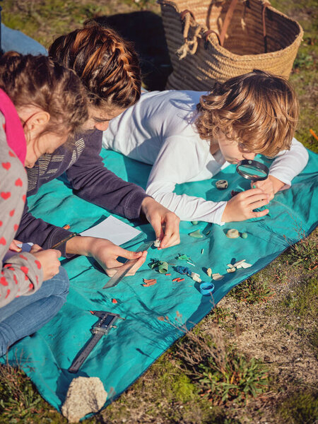 670391710 From above of focused kids lying on blue blanket on ground and observing and measuring picked up garbage and waste plastic
