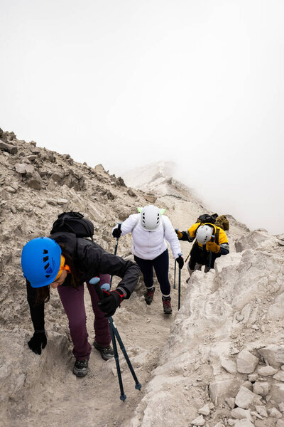 784177618 A group of mountaineers equipped with helmets and trekking poles ascend a rocky volcano slope, embodying adventure and teamwork. Perfect for outdoor and adventure-related topics.