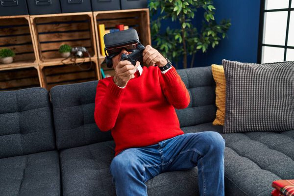 779854014 Device For Medical Education And Treatment. Portrait of adult male doctor in coat with stethoscope experiencing virtual reality in vr glasses, wearing helmet, copy space, isolated on gray background