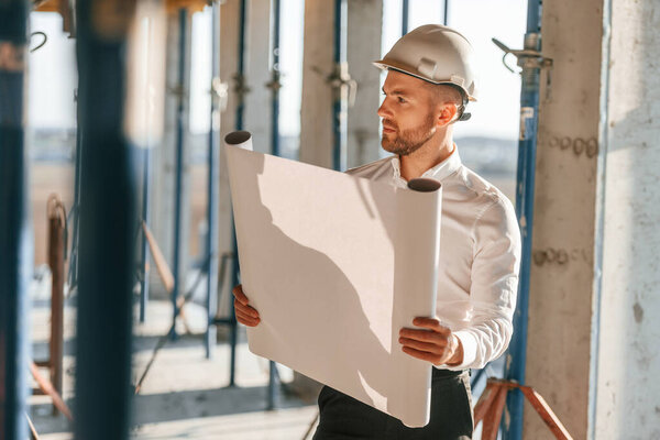 724190984 Manager is in the formal clothes. Holding plan in hands. Man is working on the construction site at daytime.
