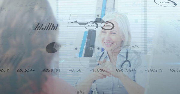 834006158 Gesturing female physician with stethoscope consulting patient in clinic, with chart overlay. Medical, healthcare, analysis, professionalism, diagnostics, consultation, digital