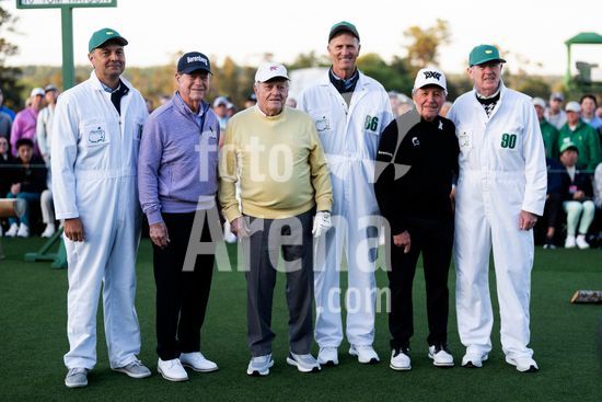 ny090426104212 Golfers Tom Watson, second from left, Jack Nicklaus, third from left, and Gary Player, second from right, with their caddies at the ceremonial first tee for the first round of the Masters Tournament at Augusta National Golf Club in Augusta, Ga., Thursday, April 9, 2026. (Doug Mills/The New York Times/Fotoarena)