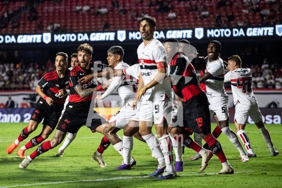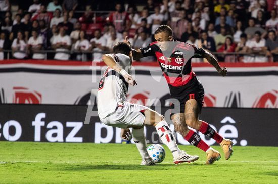 2875784 Lucas do São Paulo e S. Lino do Flamengo disputam a bola durante partida entre São Paulo FC x Flamengo, válida pela primeira rodada do Campeonato Brasileiro de Futebol 2026, nesta quarta feira (28), no Morumbis, SP.