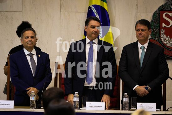 2895451 A Assembléia Legislatiiva de São Paulo, atravéz do presidente da casa, André do Prado (PL), presta homenagem de Outorga do Colar do Honra ao Mérito a Valdemar Costa Neto, presidente do PL nesta sexta-feira (27). A solenidade conta com as presenças do pré-candidato à Presidencia da República, o senador Flávio Bolsonaro (PL), o governador do Estado, Tarcísio de Freitas (Republicanos) e do prefeito da cidade, Ricardo Nunes (PMDB), entre outras autoridades. Na foto, senador Rogério Marinho, Flávio Bolsonaro e Tarcísio de Freitas.