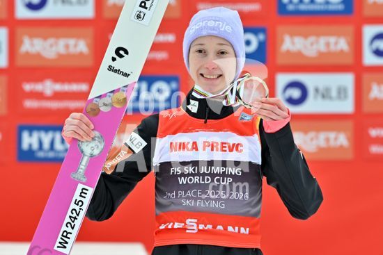 2913581 PLANICA, ESLOVENIA - 28 DE MARCO: Nika Prevc, da Eslovenia, em primeiro lugar na classificacao geral da Copa do Mundo, comemora apos a final da prova feminina de salto em rampa HS240 da Copa do Mundo de Salto de Esqui Viessmann FIS, na rampa de salto Gorisek Brothers Ski Flying Hill, em Planica, Eslovenia, em 28 de marco de 2026. (Foto de Igor Kupljenik/Sports Press Photo) (Igor Kupljenik / SPP)