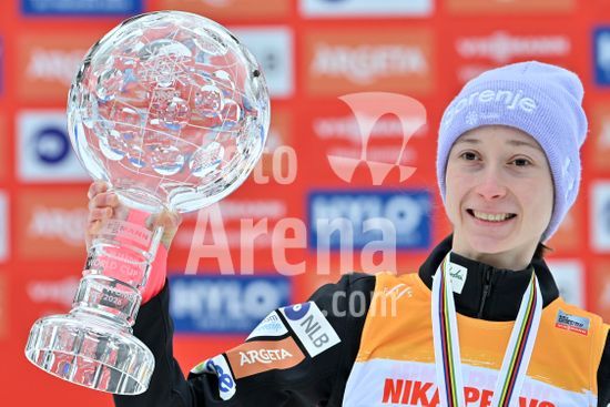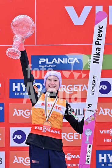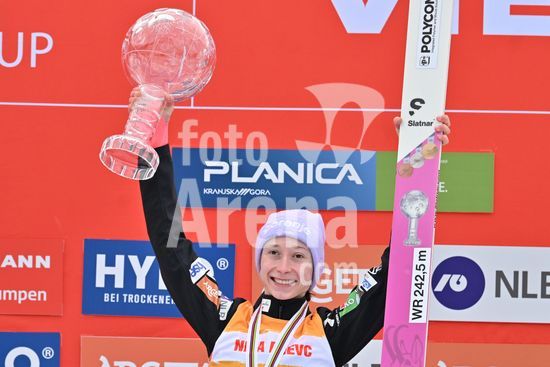 2913592 PLANICA, ESLOVENIA - 28 DE MARCO: Nika Prevc, da Eslovenia, em primeiro lugar na classificacao geral da Copa do Mundo, comemora apos a final da prova feminina de salto em rampa HS240 da Copa do Mundo de Salto de Esqui Viessmann FIS, na rampa de salto Gorisek Brothers Ski Flying Hill, em Planica, Eslovenia, em 28 de marco de 2026. (Foto de Igor Kupljenik/Sports Press Photo) (Igor Kupljenik / SPP)