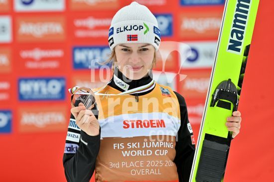 2913582 PLANICA, ESLOVENIA - 28 DE MARCO: Anna Odine Stroem, da Noruega, terceira colocada na classificacao geral da Copa do Mundo, comemora apos a final da prova feminina de salto em rampa HS240 da Copa do Mundo de Salto de Esqui Viessmann FIS, na rampa de salto Gorisek Brothers Ski Flying Hill, em Planica, Eslovenia, em 28 de marco de 2026. (Foto de Igor Kupljenik/Sports Press Photo) (Igor Kupljenik / SPP)