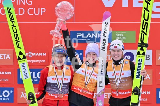 2913593 PLANICA, ESLOVENIA - 28 DE MARCO: Classificacao geral da Copa do Mundo para o Globo de Cristal: Nika Prevc, da Eslovenia (C), em primeiro lugar; Nozomi Maruyama, do Japao (E), em segundo lugar; e Anna Odine Stroem, da Noruega (D), em terceiro lugar, comemoram apos a final da Copa do Mundo de Salto de Esqui HS240 feminino, realizada no trampolim de esqui Gorisek Brothers, em Planica, Eslovenia, em 28 de marco de 2026. (Foto de Igor Kupljenik/Sports Press Photo) (Igor Kupljenik / SPP)