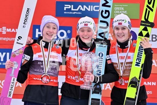 2913590 PLANICA, ESLOVENIA - 28 DE MARCO: Em pe, a norueguesa Eirin Maria Kvandal (C), em primeiro lugar; a eslovena Nika Prevc (E), em segundo; e a norueguesa Anna Odine Stroem (D), em terceiro, comemoram apos a final da Copa do Mundo de Salto de Esqui HS240 feminina, realizada na pista de salto de esqui Gorisek Brothers, em Planica, Eslovenia, em 28 de marco de 2026. (Foto de Igor Kupljenik/Sports Press Photo) (Igor Kupljenik / SPP)