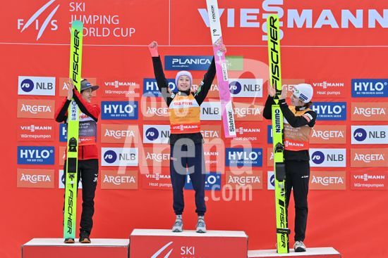 2913588 PLANICA, ESLOVENIA - 28 DE MARCO: Nika Prevc, da Eslovenia (C), em primeiro lugar; Eirin Maria Kvandal, da Noruega (E), em segundo lugar; e Nozomi Maruyama, do Japao (D), em terceiro lugar, comemoram apos a final da Copa do Mundo de Salto de Esqui HS240 feminina, realizada no trampolim Gorisek Brothers Ski Flying Hill, em Planica, Eslovenia, em 28 de marco de 2026. (Foto de Igor Kupljenik/Sports Press Photo) (Igor Kupljenik / SPP)