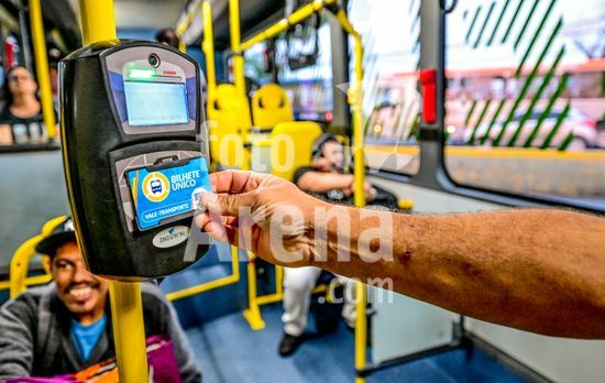 2921457 Catraca eletronica em onibus do transporte publico que funciona com o pagamento em cartão .