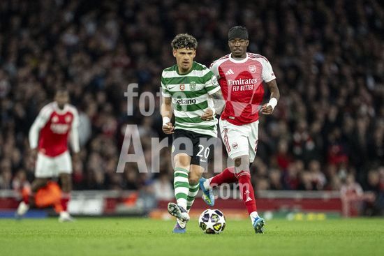 2925669 LONDRES, INGLATERRA - 15 DE ABRIL: Maximiliano Araujo, do Sporting CP, e Noni Madueke, do Arsenal, disputam a posse de bola durante a partida da Liga dos Campeoes da UEFA 2025-26 entre Arsenal e Sporting CP, no Emirates Stadium, em 15 de abril de 2026, em Londres, Inglaterra. (Pedro Loureiro/SPP)