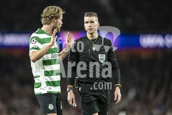 2925679 LONDRES, INGLATERRA - 15 DE ABRIL: O arbitro Francois Letexier conversa com Morten Hjulmand, do Sporting CP, durante a partida da Liga dos Campeoes da UEFA 2025-26 entre Arsenal e Sporting CP, no Emirates Stadium, em 15 de abril de 2026, em Londres, Inglaterra. (Pedro Loureiro/SPP)