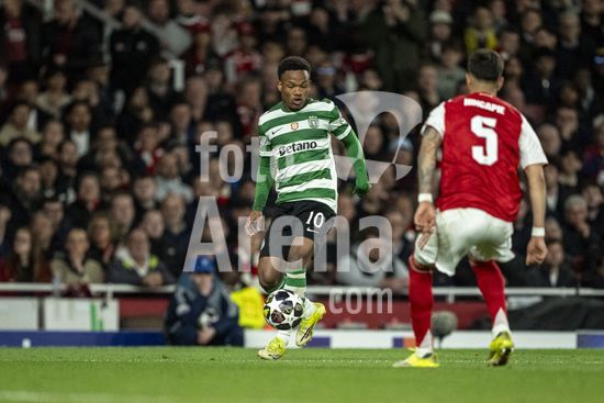 2925688 LONDRES, INGLATERRA - 15 DE ABRIL: Geny Catamo, do Sporting CP, corre com a bola durante uma partida da Liga dos Campeoes da UEFA 2025-26 entre Arsenal e Sporting CP no Emirates Stadium, em 15 de abril de 2026, em Londres, Inglaterra. (Pedro Loureiro/SPP)