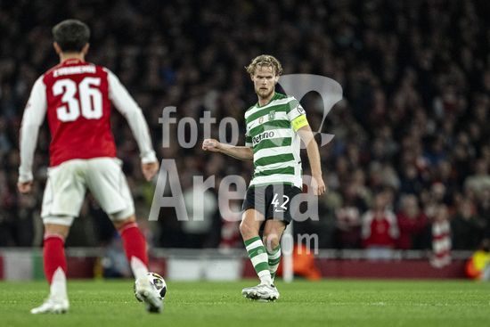 2925681 LONDRES, INGLATERRA - 15 DE ABRIL: Morten Hjulmand, do Sporting CP, passa a bola durante uma partida da Liga dos Campeoes da UEFA 2025-26 entre Arsenal e Sporting CP no Emirates Stadium, em 15 de abril de 2026, em Londres, Inglaterra. (Pedro Loureiro/SPP)
