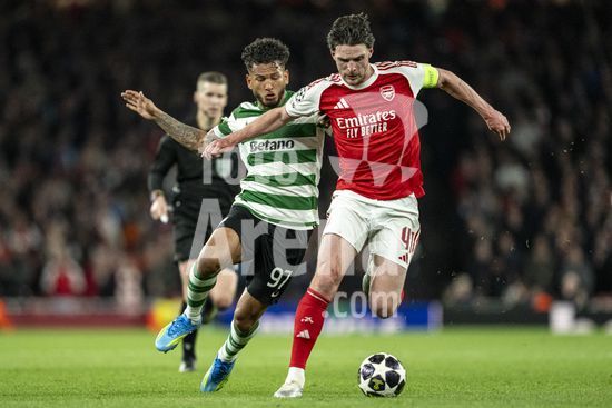 2925682 LONDRES, INGLATERRA - 15 DE ABRIL: Declan Rice, do Arsenal (D), e Luis Suarez, do Sporting CP (E), disputam a posse de bola durante a partida da Liga dos Campeoes da UEFA 2025-26 entre Arsenal e Sporting CP, no Emirates Stadium, em 15 de abril de 2026, em Londres, Inglaterra. (Pedro Loureiro/SPP)