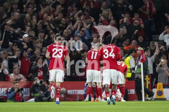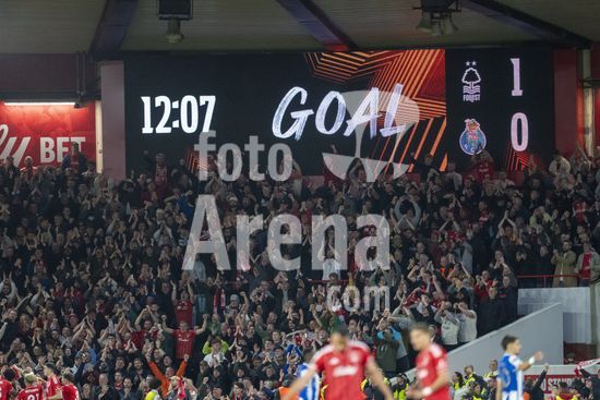 2926334 NOTTINGHAM, INGLATERRA - 16 DE ABRIL: Telao anuncia o primeiro gol do Forest durante uma partida da Liga Europa da UEFA entre Nottingham Forest e Porto no City Ground em 16 de abril de 2026 em Nottingham, Inglaterra. (Foto de Pedro Loureiro/Sports Press Photo) (Pedro Loureiro/Sports Press Photo / SPP)