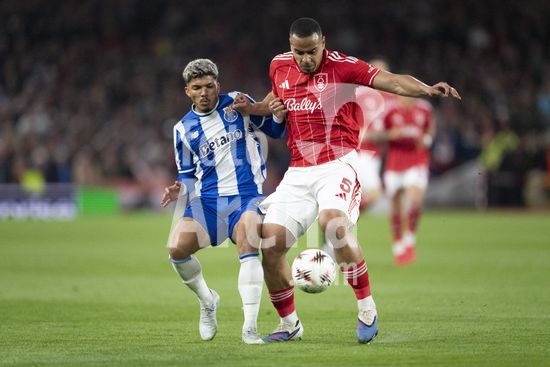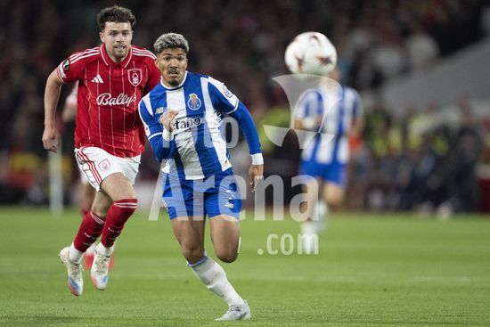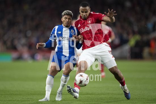 2926356 NOTTINGHAM, INGLATERRA - 16 DE ABRIL: Terem Moffi, do Porto, e Jair Cunha, do Nottingham Forest, disputam a posse de bola durante uma partida da Liga Europa da UEFA entre Nottingham Forest e Porto, no City Ground, em 16 de abril de 2026, em Nottingham, Inglaterra. (Foto de Pedro Loureiro/Sports Press Photo) (Pedro Loureiro/Sports Press Photo / SPP)
