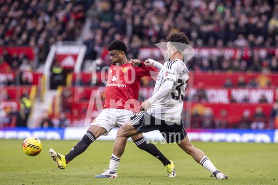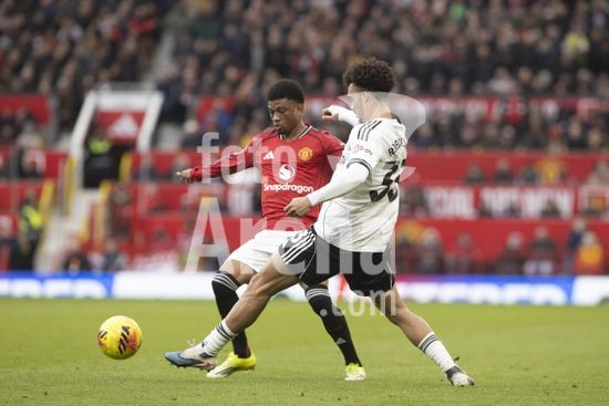 2877666 MANCHESTER, INGLATERRA - 1 DE FEVEREIRO: Amad Diallo, do Manchester United, e Antonee Robinson, do Fulham, disputam a posse de bola durante uma partida da Premier League de 2026 entre Manchester United e Fulham, no Old Trafford, em 1º de fevereiro de 2026, em Manchester, Inglaterra(Richard Callis/Fotoarena)
