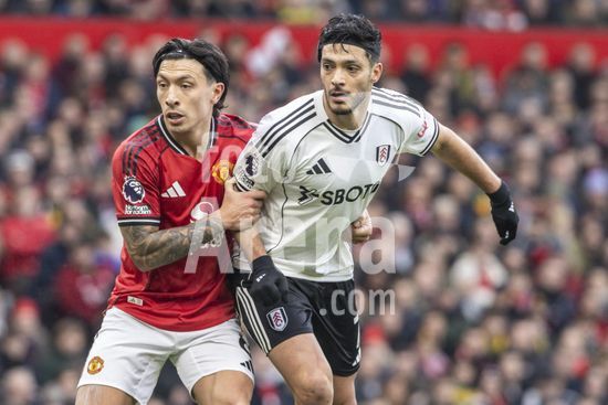 2877670 MANCHESTER, INGLATERRA - 1 DE FEVEREIRO: Lisandro Martinez, do Manchester United, e Raul Jimenez, do Fulham, disputam a posse de bola durante uma partida da Premier League de 2026 entre Manchester United e Fulham, no Old Trafford, em 1º de fevereiro de 2026, em Manchester, Inglaterra. (Richard Callis/Fotoarena)