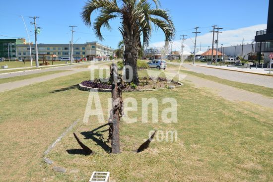 2881210 Imagens de uma âncora naval antiga, completamente enferrujada, instalada como objeto de decoração, sem descrição de dados e/ou outras informações, localizada no canteiro central da Avenida Rio Grande, na Praia do Cassino, em Rio Grande. Rio Grande, RS (07).