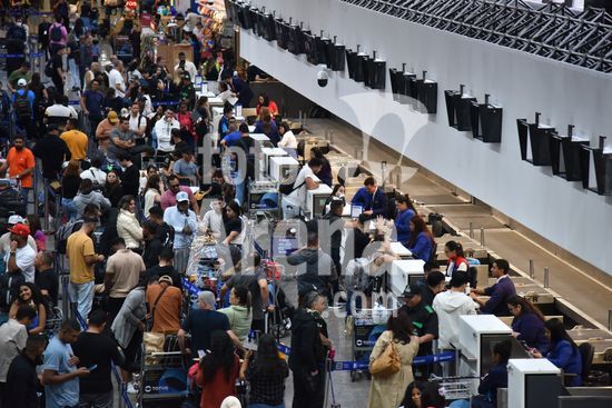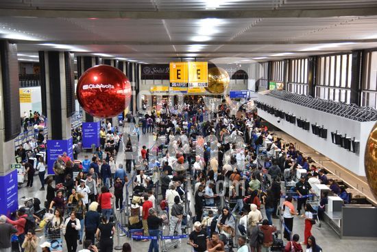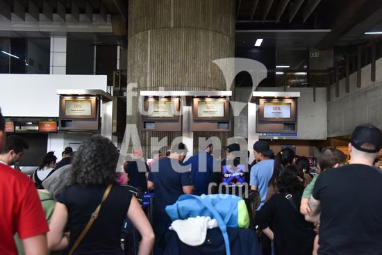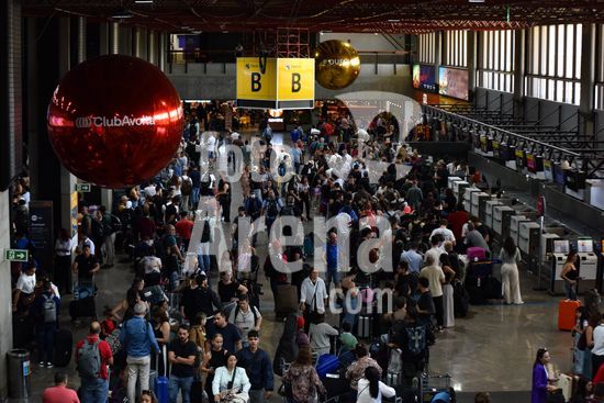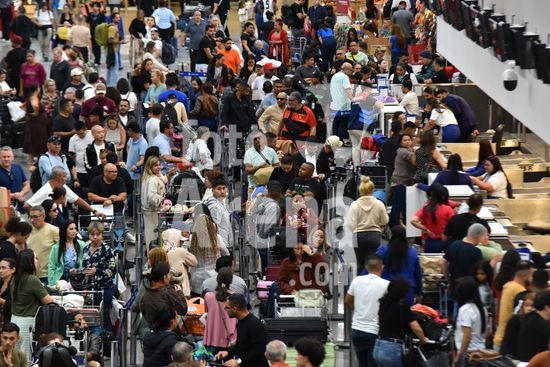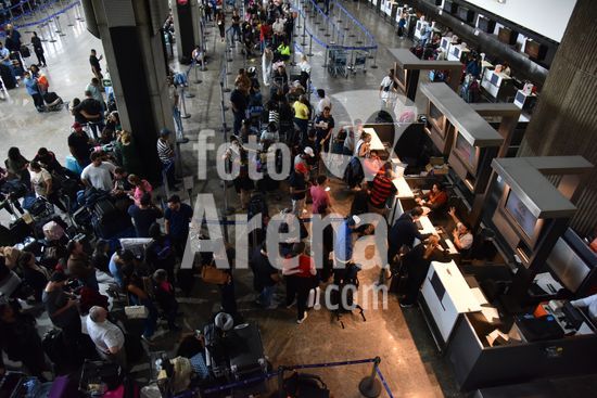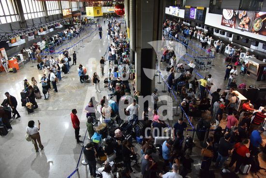 2857540 Aeroporto Internacional de Guarulhos tem voos cancelados e operação afetada devido aos efeitos do ciclone extratropical, nesta quinta feira (11). Na foto fila de passageiros aguardando.