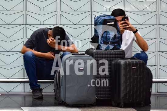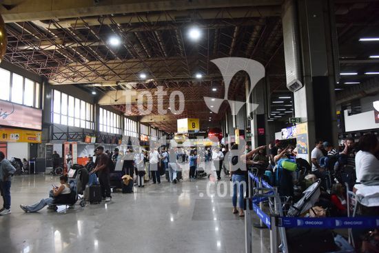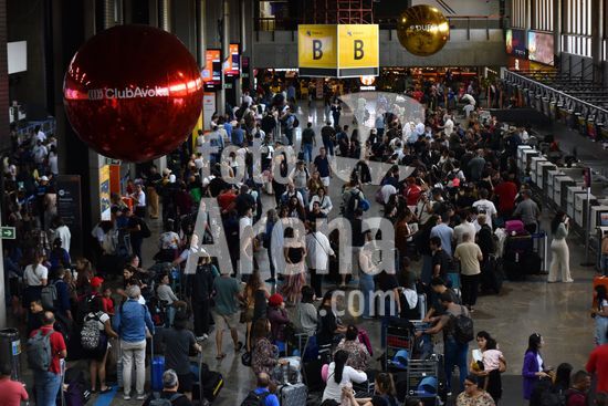 2857544 Aeroporto Internacional de Guarulhos tem voos cancelados e operação afetada devido aos efeitos do ciclone extratropical, nesta quinta feira (11). Na foto fila de passageiros aguardando.