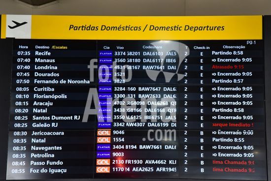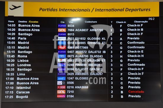 2857542 Aeroporto Internacional de Guarulhos tem voos cancelados e operação afetada devido aos efeitos do ciclone extratropical, nesta quinta feira (11). Na foto Painel indica voo atrasado.