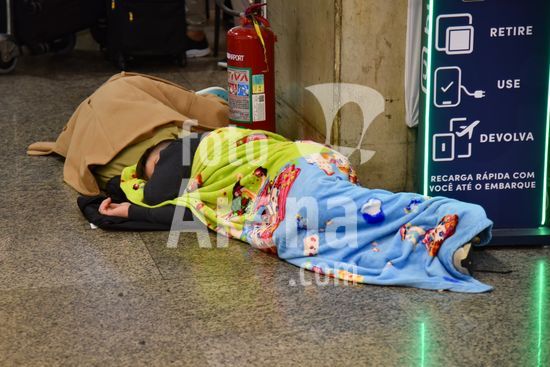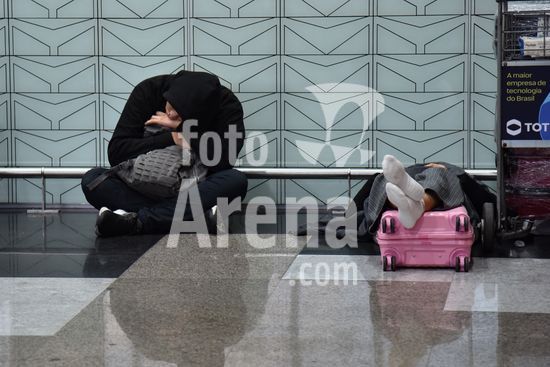 2857545 Aeroporto Internacional de Guarulhos tem voos cancelados e operação afetada devido aos efeitos do ciclone extratropical, nesta quinta feira (11). Na foto passageiros aguardam deitados no chão.